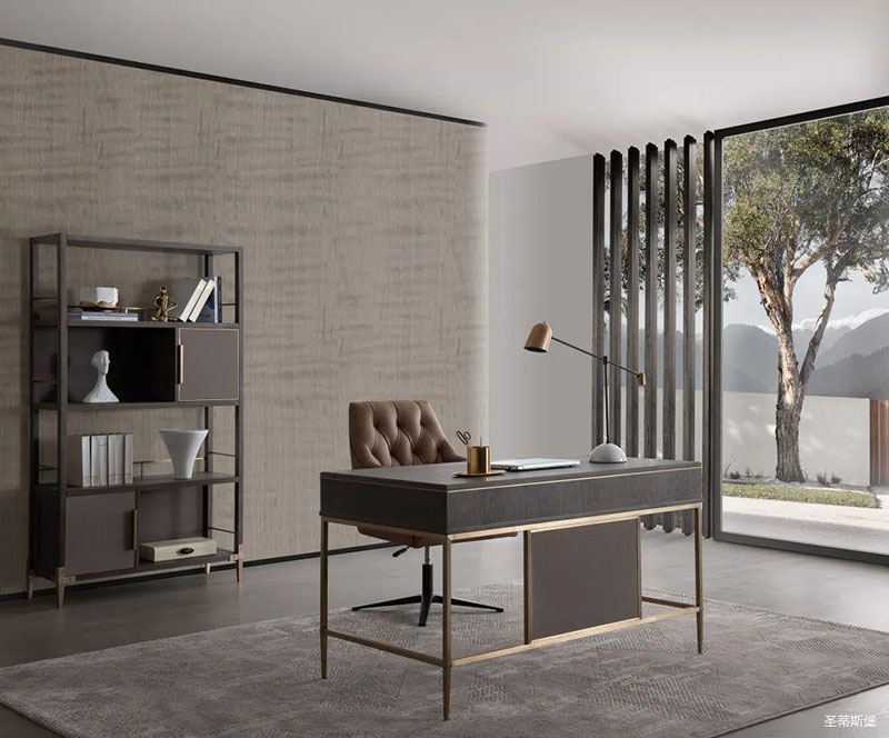 沉静雅致的书房空间,温润实木与硬朗金属线条相互配合,运用基础几何,打造空间的高级感。轻奢质感缓缓流淌,书籍整齐,摆件精致,无一不追求着精致细节与极致的品味,营造出时尚与沉稳并列的氛围,诠释着居者对是生活环境的内在追求。